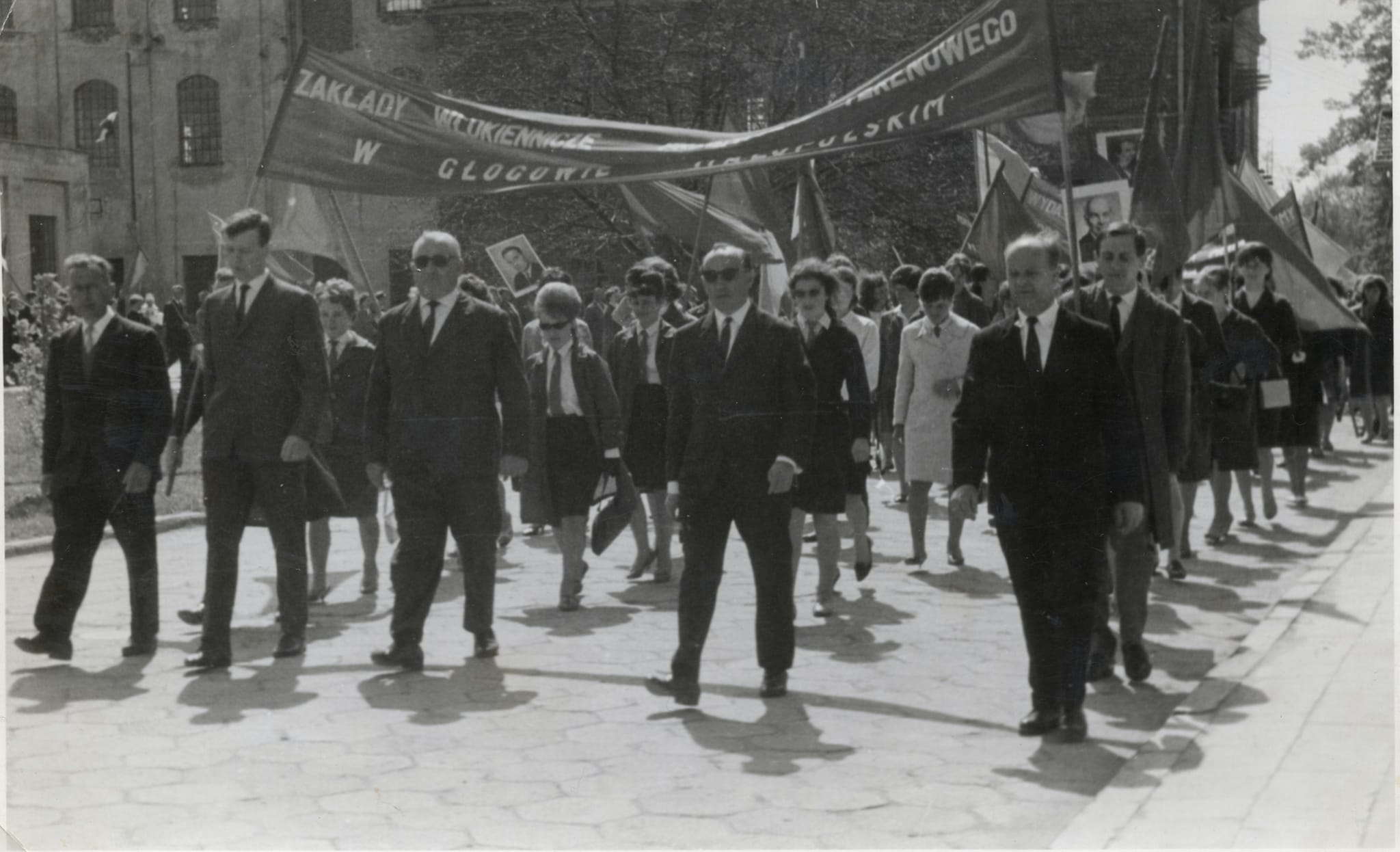 Jeden z pochodów pierwszomajowych w Głogowie. Ulicą Fabryczną maszerują pracownicy „Technitexu”. W tle widoczny budynek fabryki. Zdjęcie niedatowane – prawdopodobnie lata 70-te XX w. Zdjęcie z kolekcji p. Janusza Guziora. Dziękuję za udostępnienie.