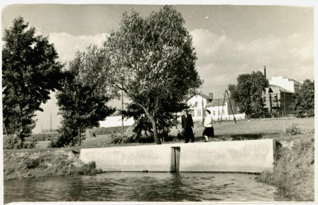 W tle budynki fabryki włokienniczej „Lnianka”. Wyraźnie wyróżnia się prawdopodobnie świeżo odbudowana (nieotynkowana) część budynku głównego , która została zniszczona podczas bombardowania w 1944 roku.