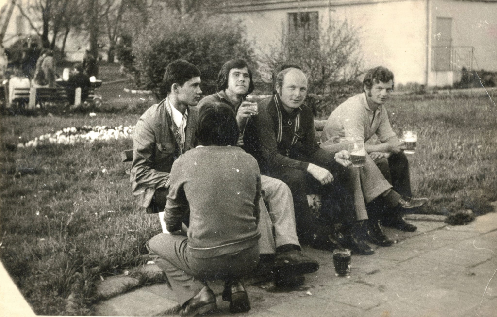 Pięciu panów (wśród nich K. Adamski i K. Żmuda) pije piwo na ławce przed restauracją „Leśna” na Rynku w Głogowie. W tle widoczne planty i przystanek PKS-u. W tamtych czasach nie obowiązywały tak rygorystyczne jak obecnie przepisy dotyczące spożywania alkoholu w miejscach publicznych.