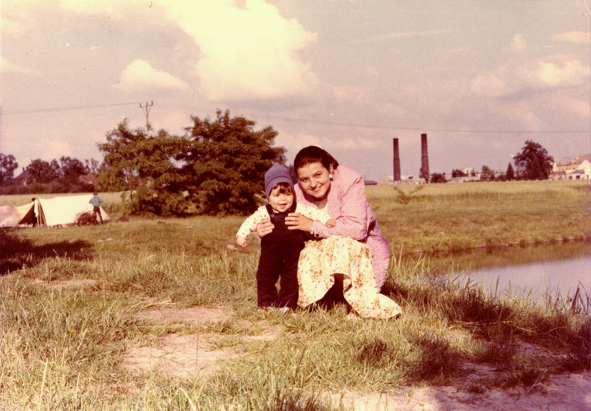 pomiędzy głogowskimi „basenami”. Po lewej stronie widoczne są dwa namioty turystów a po prawej zabudowania fabryki „Technitex” z dwoma charakterystycznymi kominami.