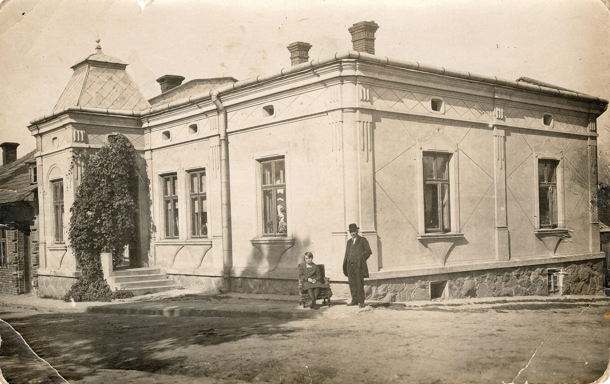 Na tle domu do zdjęcia pozuje starszy elegancko ubrany mężczyzna (prawdopodobnie p. Brzuza) a obok na fotelu siedzi sporo młodsza kobieta (być może jedna z jego trzech córek). Uwagę zwraca także roślina , opleciona nad wejściem do domu.