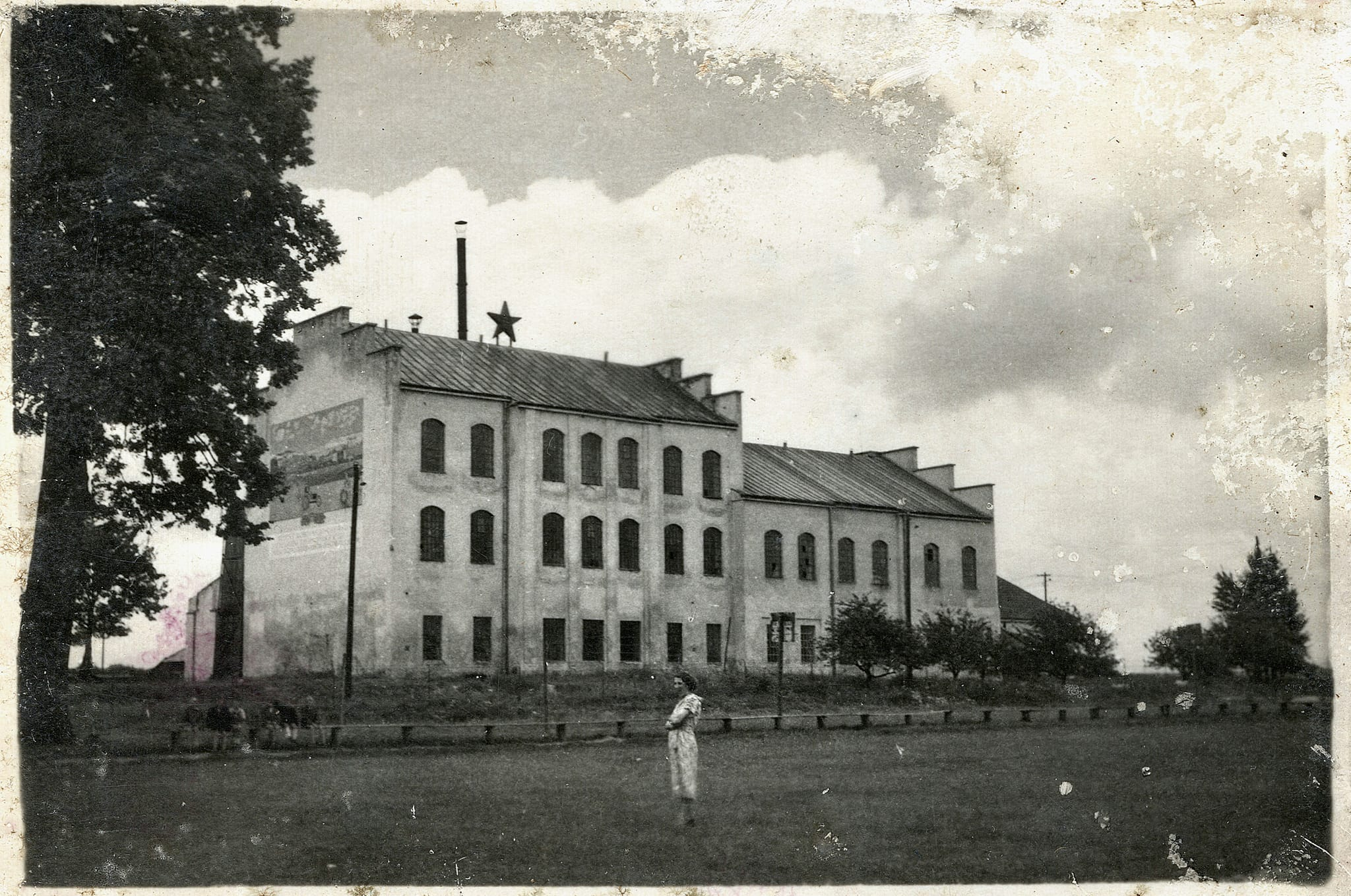 Kobieta stojąc na murawie boiska w Głogowie pozuje do zdjęcia na tle budynku głównego fabryki „Lnianki” (dawnego pałacu Lubomirskich). Doskonale widoczny jest brak zachodniej (na zdjęciu – lewej) części budynku zniszczonej w 1944 roku. Widoczna jest także czerwona gwiazda , umieszczona na dachu.