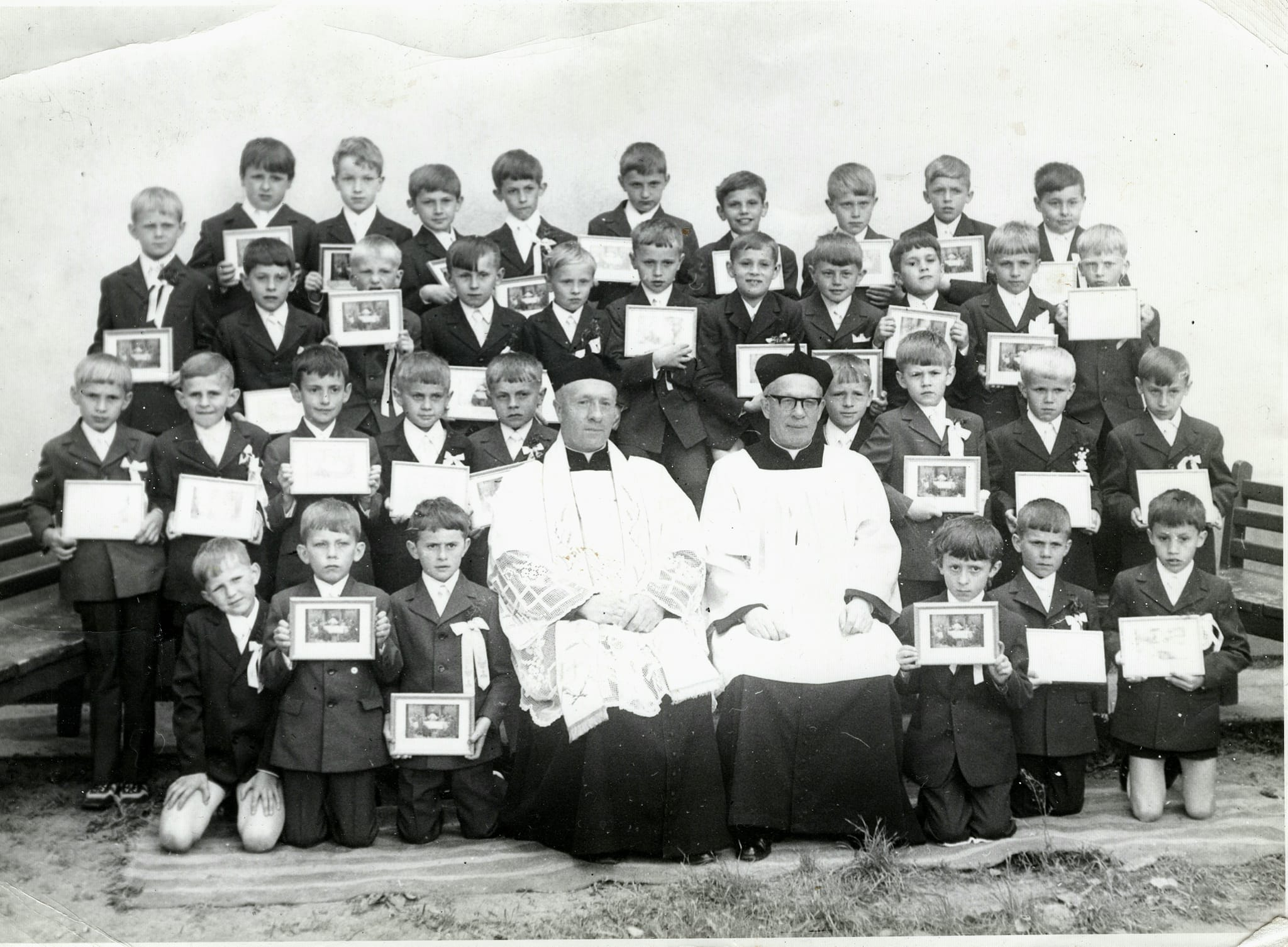 Kościół i uroczystości kościelne Dzieci z rocznika ’61 pozują do pamiątkowego zdjęcia z ks. Puzio obok kościoła parafialnego w Głogowie.