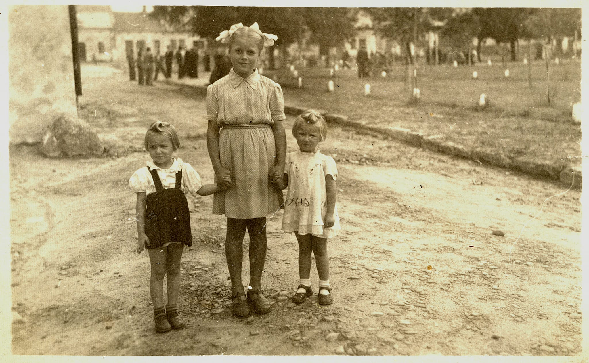 Z tyłu za nimi widać sporą grupę mężczyzn. W tle widoczne są planty i domy w Rynku od numeru 25 do 32. Zdjęcie niedatowane – prawdopodobnie lata 40/50-te XX w. Zdjęcie pochodzi z kolekcji p. Barbary Lis. Dziękuję za udostępnienie.