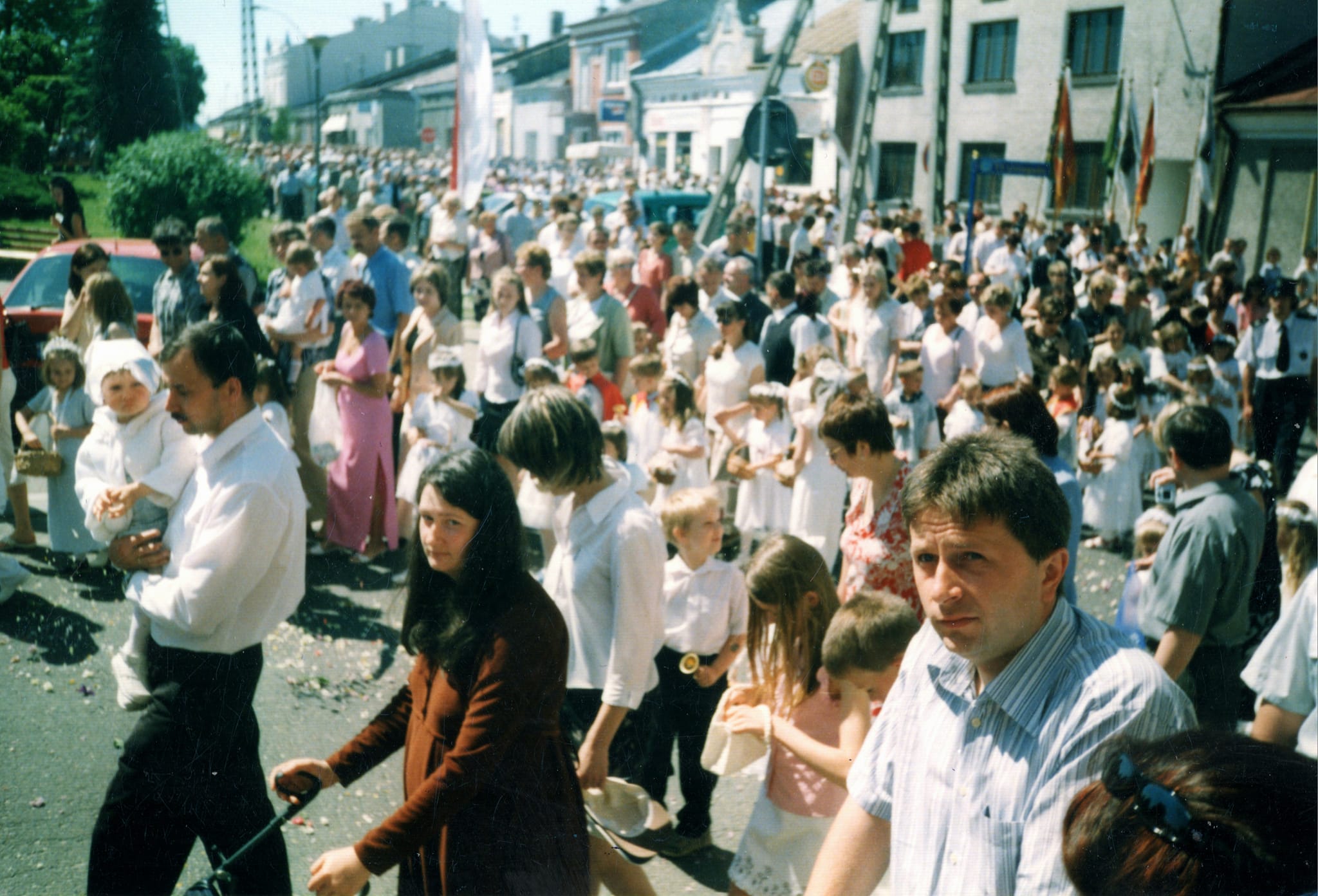 Kościół i uroczystości kościelne Procesja Bożego Ciała na głogowskim Rynku.W tle domy nr 40 , 40a i 41.