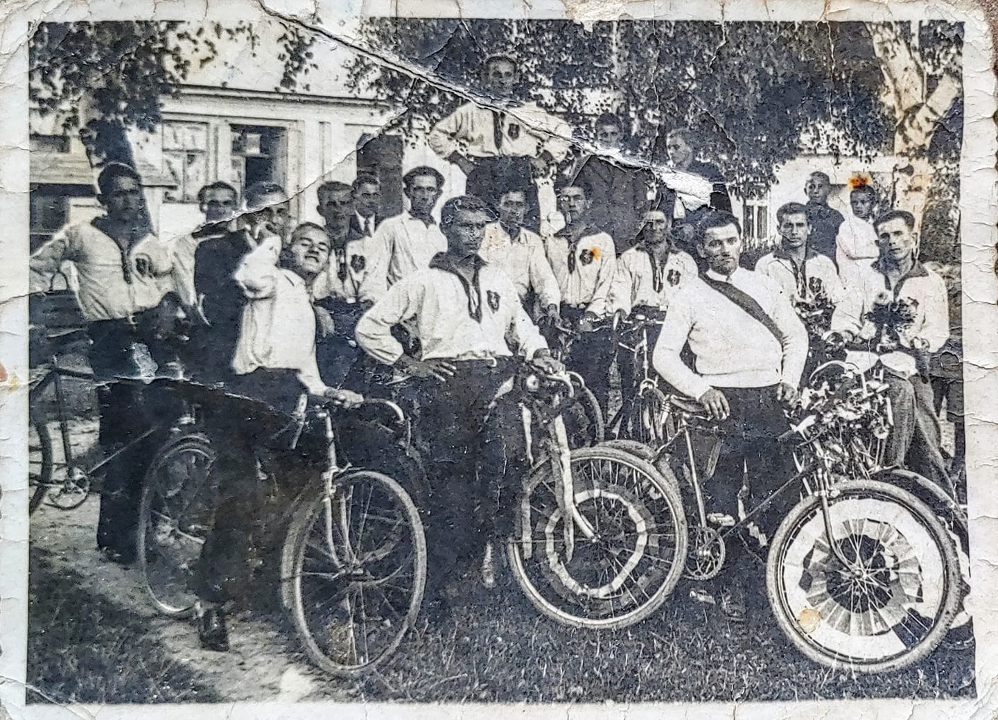 Grupa mieszkańców miasta pozuje do zdjęcia na Rynku w Głogowie razem ze swoimi rowerami.Lata 20-te XX-go wieku.