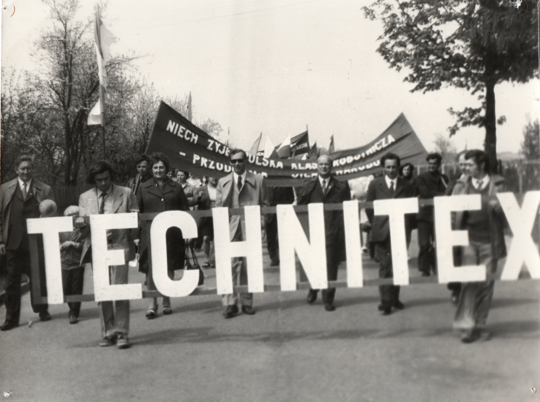 Pałac / Fabryka · Wydarzenia Jeden z pochodów pierwszomajowych w Głogowie. Ulicą Fabryczną maszerują pracownicy „Technitexu”. W tle widoczny budynek fabryki.