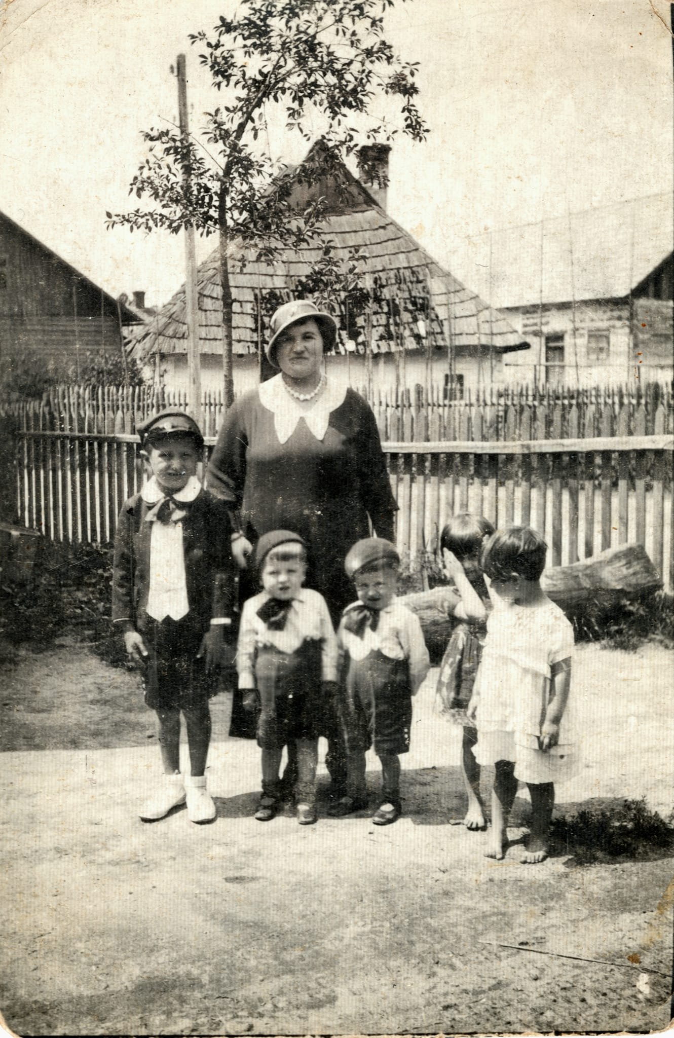 Pani Maria Sokołowska z synem Edmundem i bliźniakami – Czesławem i Henrykiem oraz dwójką innych dzieci pozuje do zdjęcia na tle jednego z drewnianych domów przy ulicy Kościelnej , tego samego , który znamy z powojennych zdjęć Franciszka Kotuli.