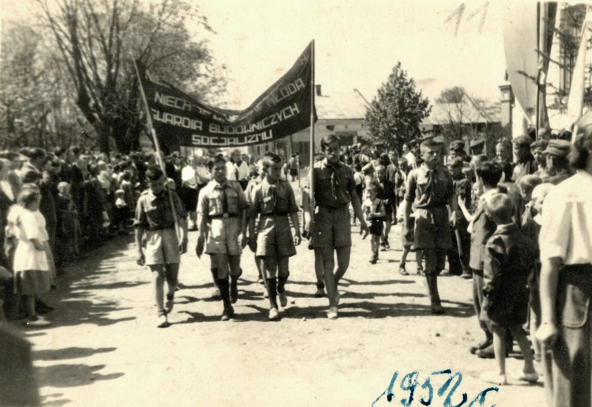 Pałac / Fabryka · Wydarzenia Jeden z pochodów pierwszomajowych w Głogowie. Ulicą obok ratusza maszerują pracownicy „Technitexu”.