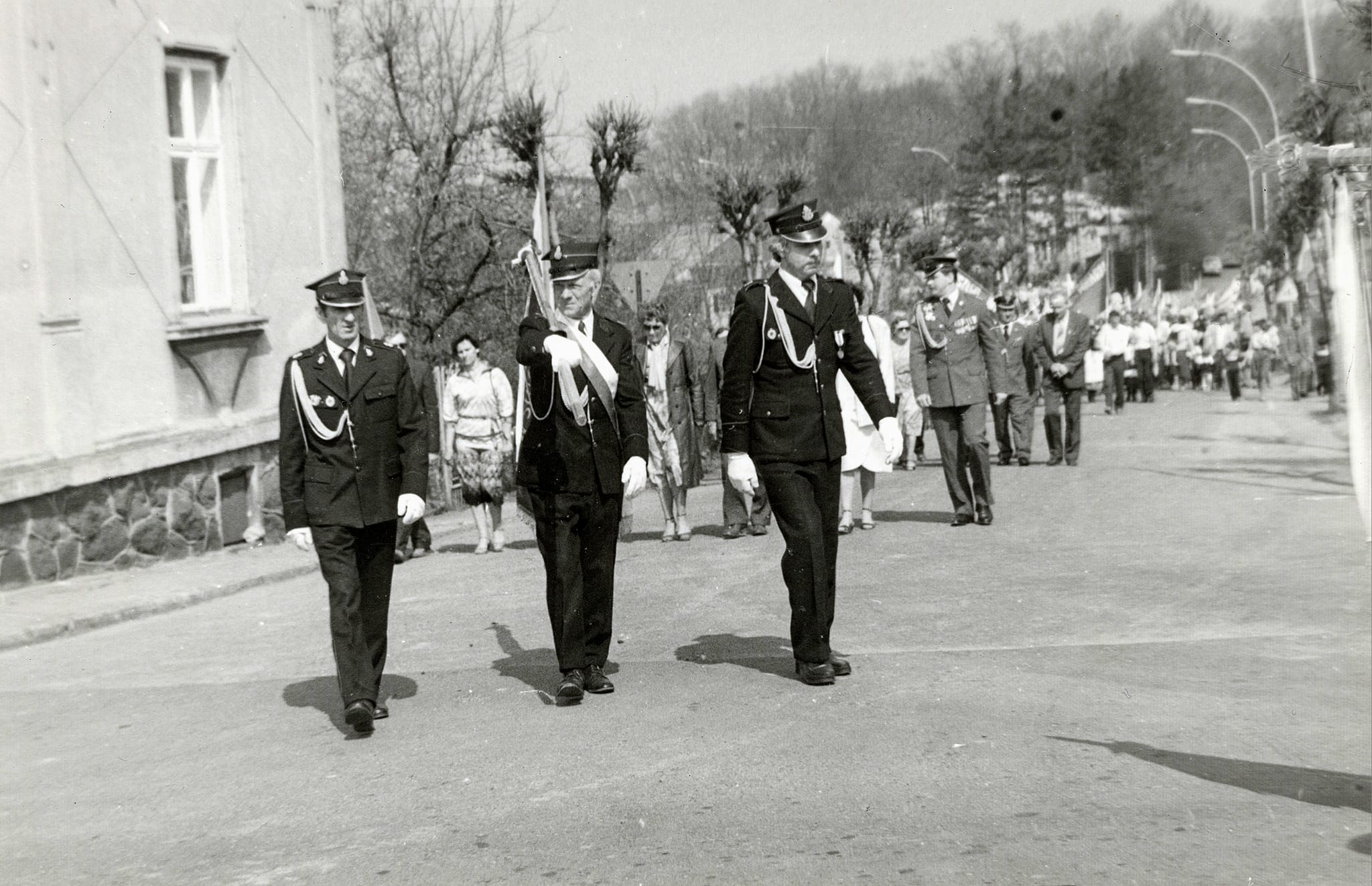 Wydarzenia Pochód pierwszomajowy w Głogowie z udziałem strażaków OSP Głogów (Rynek) , prawdopodobnie lata 70-te XX w.