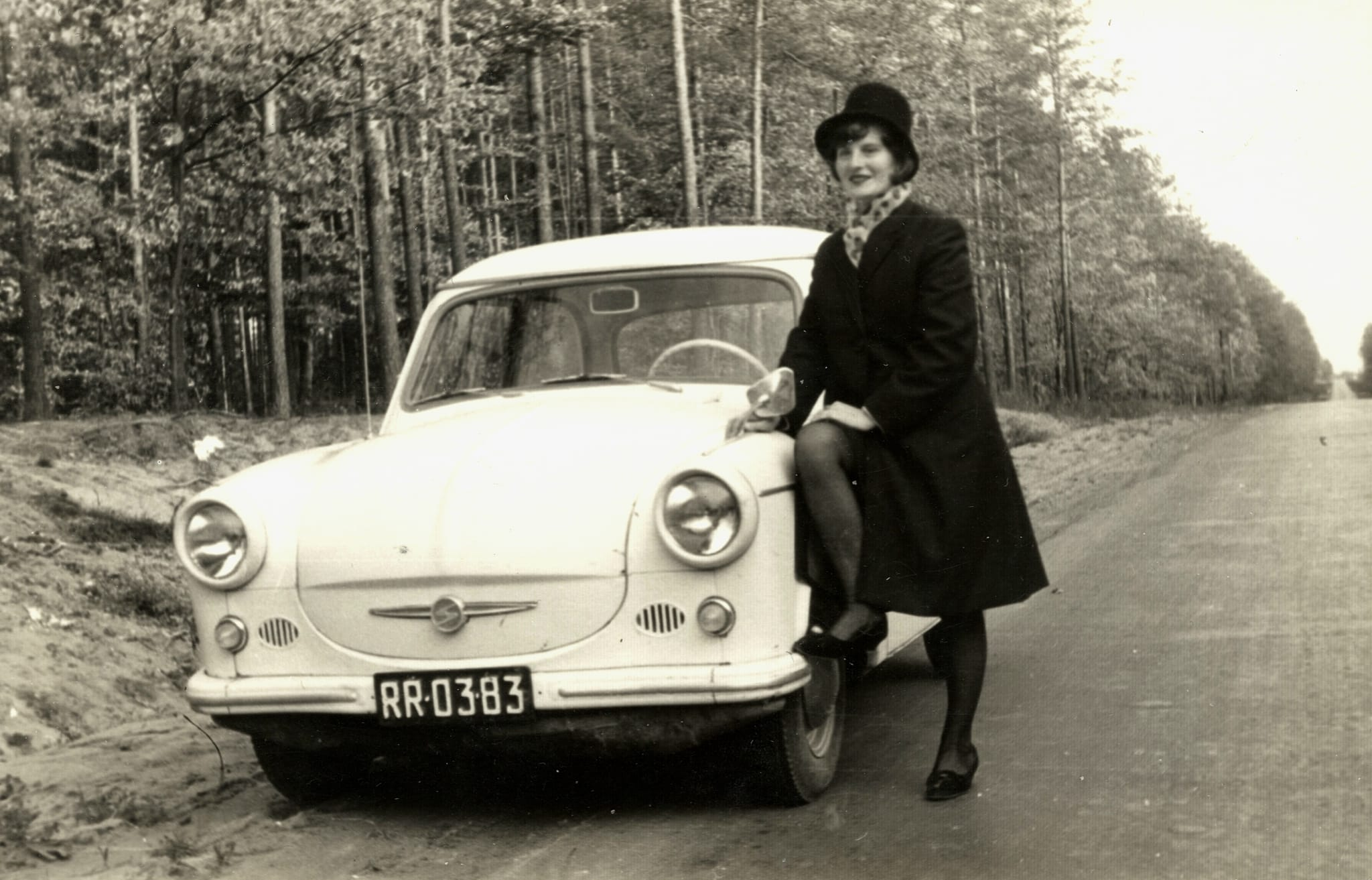 Pani Anna Winiarska pozuje do zdjęcia przy swoim samochodzie marki Trabant. Zdjęcie datowane – 1966 r. Zdjęcie pochodzi z kolekcji państwa Winiarskich. Dziękuję za udostępnienie zdjęcia.