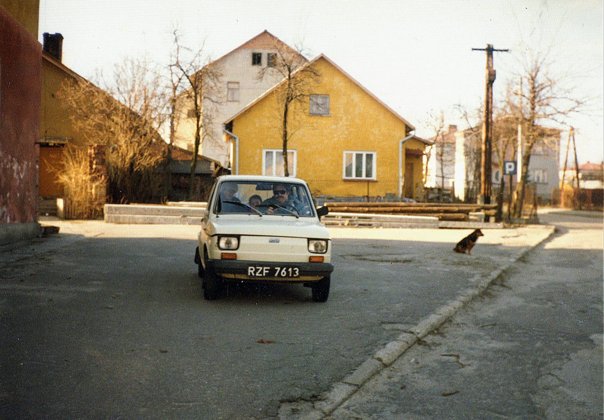 Pani Anna Bąk z mężem i dzieckiem siedzą w zaparkowanym Fiacie 126p obok budynku dzisiejszego liceum. W tle widać kilka budynków przy ulicy Krzywej : nr 1 , nr 3 , nr 12 i nr 16.