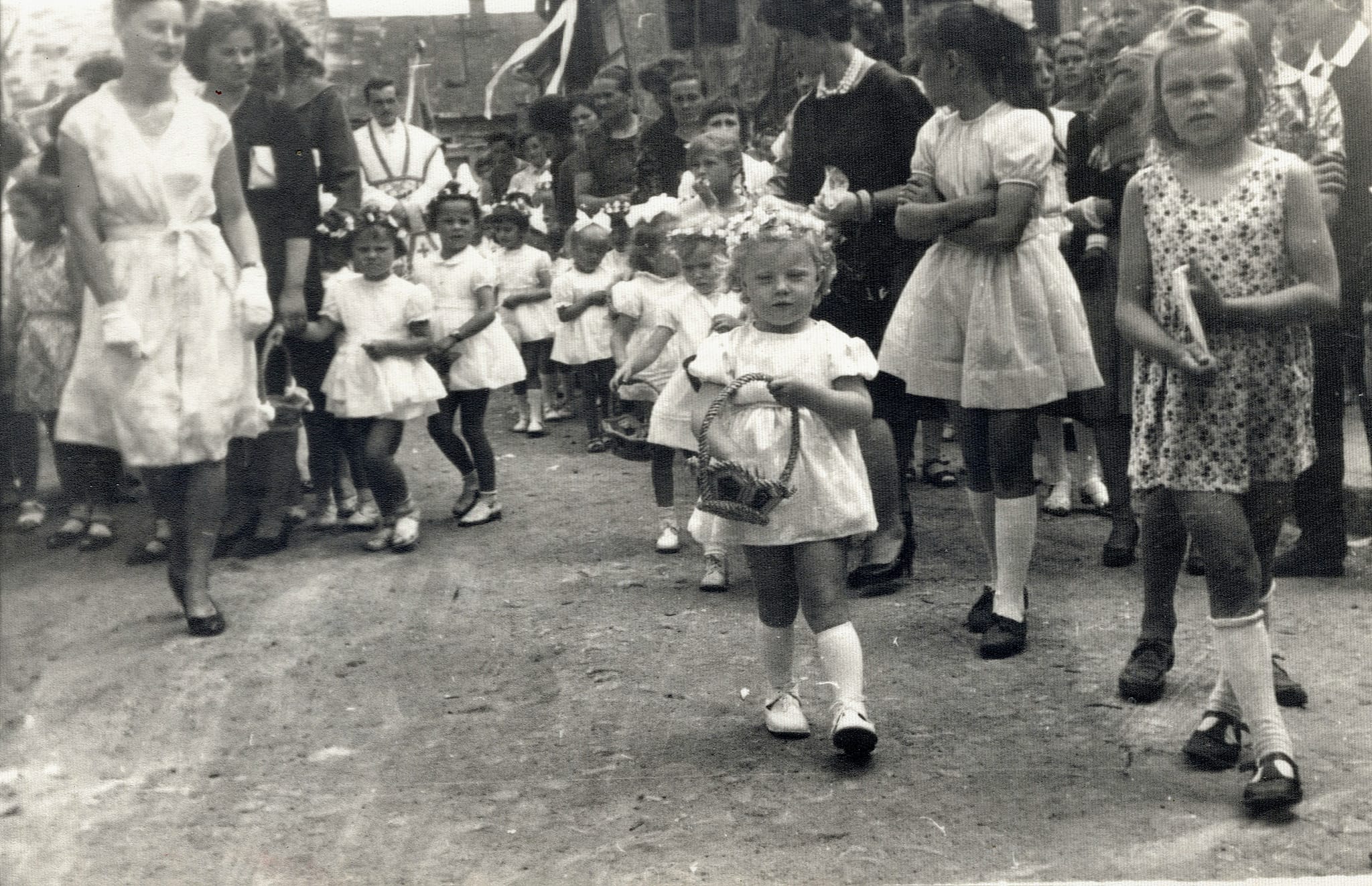 Kościół i uroczystości kościelne Procesja Bożego Ciała na głogowskim Rynku.W tle domy nr 40 , 40a i 41.