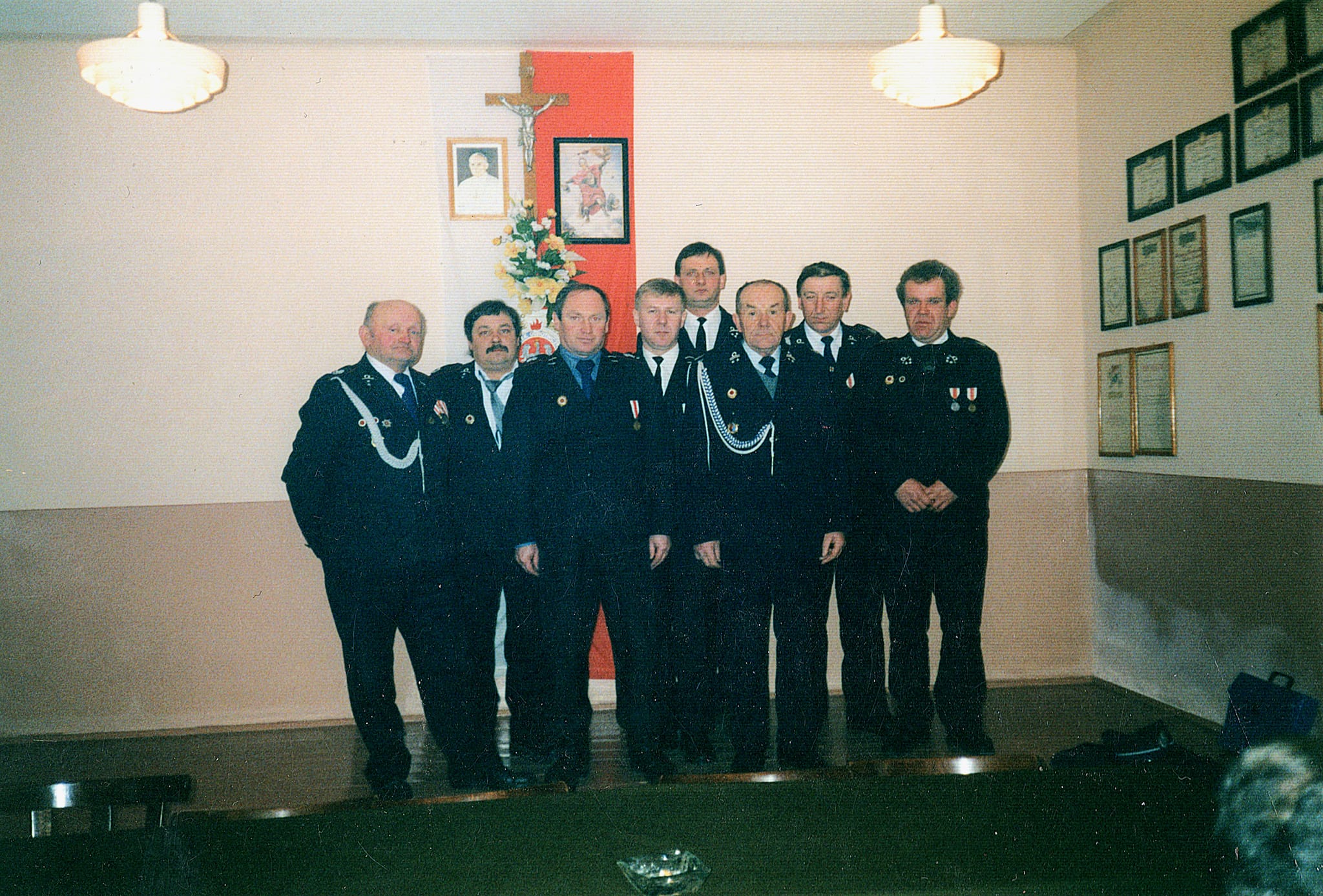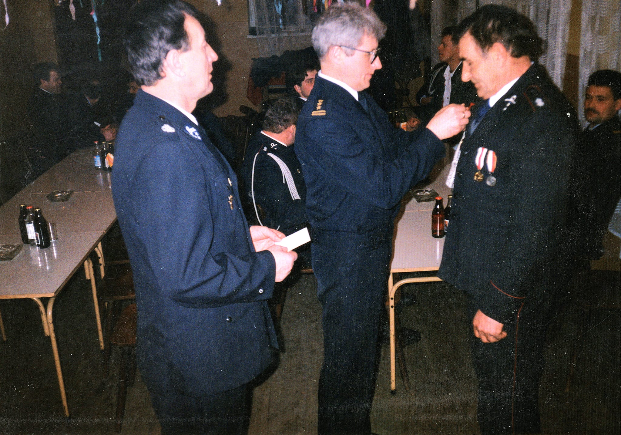 OSP Komendant miejsko-gminny ZOSP p. Roman Bazan i prezes miejsko-gminnego zarządu ZOSP p. Tadeusz Dobrowolski dekorują odznaczeniami strażaków z OSP Przewrotne (m.in. p. Buczka , p. Brudza i p. Kaczora) w remizie OSP w Głogowie.