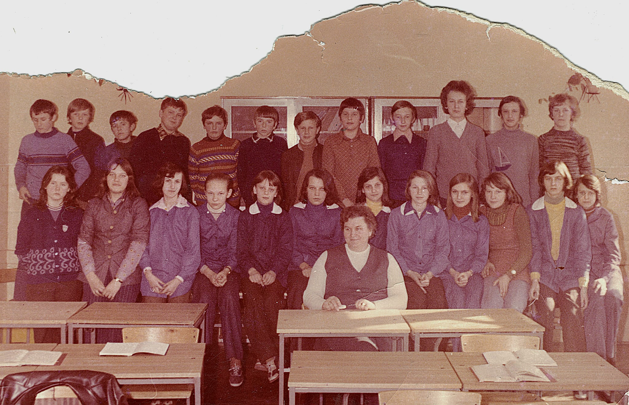 Edukacja i szkoła Pamiątkowe zdjęcie uczniów VI klasy szkoły podstawowej w Głogowie rocznika ’65 wraz z wychowawcą p. Karolem Kamlerem.