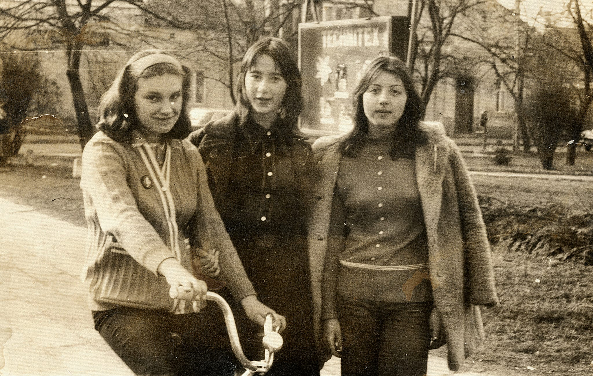 Pani Anna Wszoła (w środku) wraz z koleżankami pozuje do zdjęcia na głogowskich plantach. W tle widoczna tablica z napisem „Technitex” oraz domy w Rynku nr 3 , 4 , 5 i 6.